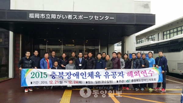 지난 23일 일본 후쿠오카현에 위치한 장애인전용 체육시설 산산프라자 앞에서 충북장애인체육회와 가맹경기단체가 연수를 마친 뒤 기념촬영을 하고 있다.