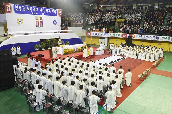 (동양일보 조아라 기자) ‘2016 사제·부제 서품식’이 12일 오전 10시 청주 실내체육관에서 교구 사제단과 수도자, 신자 5000여명이 참석한 가운데 열렸다.