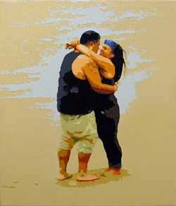 사진을 픽셀화 하는 것은 디지털적인 작업이지만 이것을 캔버스에 옮기는 것은 아날로그적 작업이다. 그래서 그의 작품 속에는 디지털과 아날로그적 감성이 공존하고 있다.
