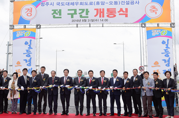 ▲ 청주시는 국도대체우회도로 휴암~오동 건설공사 전구간 개통식을 31일 오후 청원구 오동동 오동교차로 일원에서 가졌다. 이번 도로 개통으로 청주 동서남북 어느 지역을 가더라도 20분 이내에 연결될 것으로 기대되고 있다. <사진·최지현>