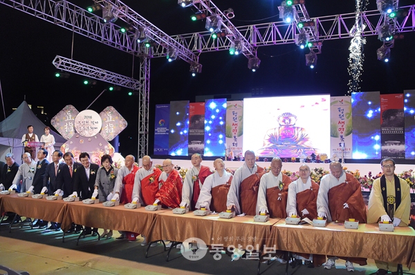 ▲ 전통문화계승발전연구회에서 주최하고 청주시불교연합회에서 후원하는 2016 무심천 직지유등문화제가 지난 3일 오후 무심천 체육공원에서 봉행됐다. 이날 참석자들이 유등문화제를 축하하기 위해 펼쳐지는 불꽃놀이 시작버튼을 누르고 있다. <사진·최지현>