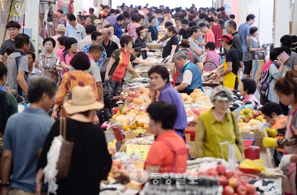 ▲ 추석 연휴를 사흘 앞둔 11일 청주 육거리 시장이 제수용품을 구입하기 위한 시민들로 북새통을 이루고 있다. <사진·최지현>