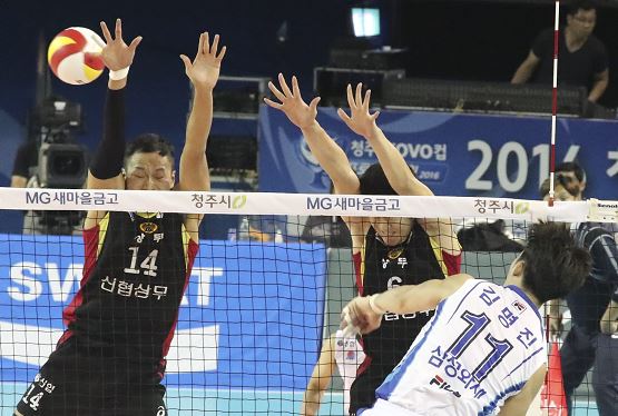 삼성화재는 OK저축은행에서 영입한 센터 김규민과 최귀엽의 블로킹으로 신협상무의 공격을 차단하면서 1세트를 가져갔다.
