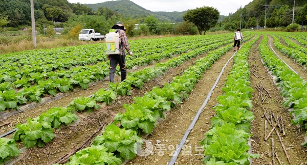 ▲ 29일 청주시 청원구 낭성면 한 배추밭에 소독이 한창이다. 생산자는 이달 내린 많은 비에 김장용 배추가 잘 익어가고 있어 지난 추석 때처럼 가격이 폭등하지 않을 것으로 예상했다. <사진·최지현>