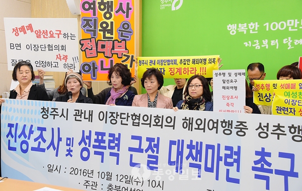 ▲ 충북여성연대와 충북시민단체연대회의는 12일 청주시청 브리핑룸에서 기자회견을 열고 지난달 청주시 B면 이장단협의회 해외 연수 당시 일부 회원이 여행사 여직원 2명을 성추행했다고 주장하고 있다. <사진·최지현>