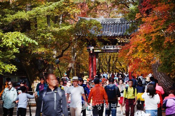 ▲ 서리가 내린다는 절기 ‘상강(霜降)’인 23일 전국 곳곳이 흐리고 오후 들어 비가 내렸지만 보은 속리산은 단풍에 물들려는 탐방객들로 인산인해를 이뤘다. 속리산국립공원에는 이날 오전에만 8000명이 넘는 탐방객이 가을 산의 정취를 만끽했다. 화려한 색깔의 옷으로 갈아입은 속리산의 비경과 단풍을 보려는 등산객들이 산행을 하고 있다. <사진·최지현>
