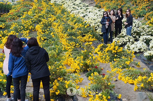 ▲ 완연한 가을로 접어든 26일 청주시 상당산성 유휴지에 조성된 형형색색 국화에 매료된 시민들이 사진을 찍으며 가을을 만끽하고 있다. <사진·최지현>