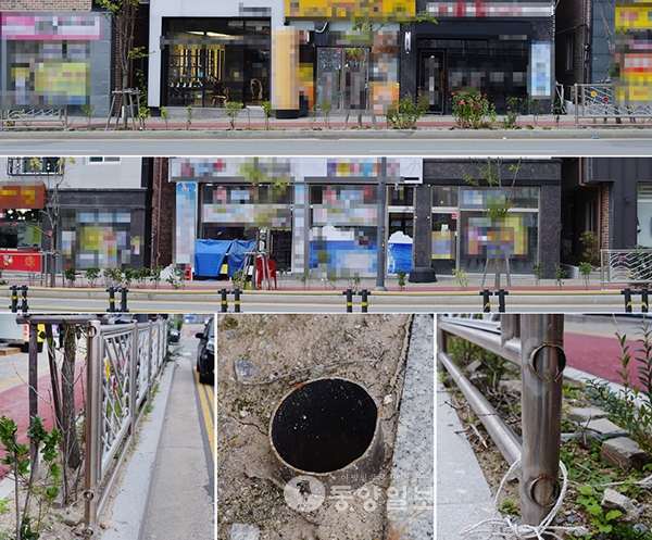 ▲ 청주시 청원구 율량동 주성중 인근 상가 도로에 안전을 위해 설치된 펜스가 고의적으로 파손돼 있다. 27일 본보가 확인한 결과 상가가 밀집되어 있는 곳 위주로 파손이 심각해 주변 학교 학생과 주택가 시민들의 안전을 위협하고 있다. 청주시는 이와 관련 “실태 확인 후 관련 법률에 따라 민·형사상 책임을 물어 고발조치할 예정”이라고 말했다. <사진·최지현>