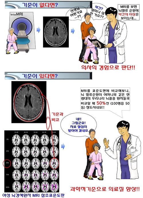 뇌경색 환자의 뇌 MRI 영상을 촬영한 뒤, 한국인 허혈 뇌지도와 비교해보면 뇌 건강 나이 즉, 만성 허혈성 뇌손상 정도가 100명중 몇 등(상위권일수록 뇌손상 정도가 낮음)에 해당하는지 알 수 있다.