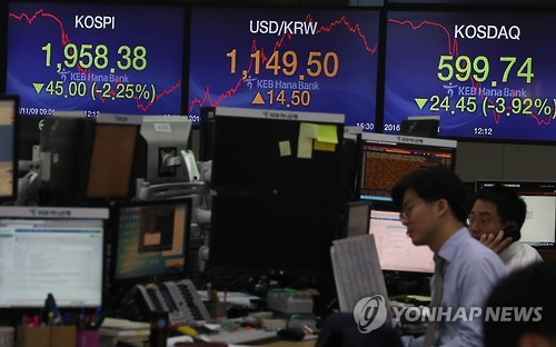 이날 한국 코스피는 2.25% 떨어진 1,958.38, 코스닥 지수는 3.92% 내린 599.74로 마감했다.