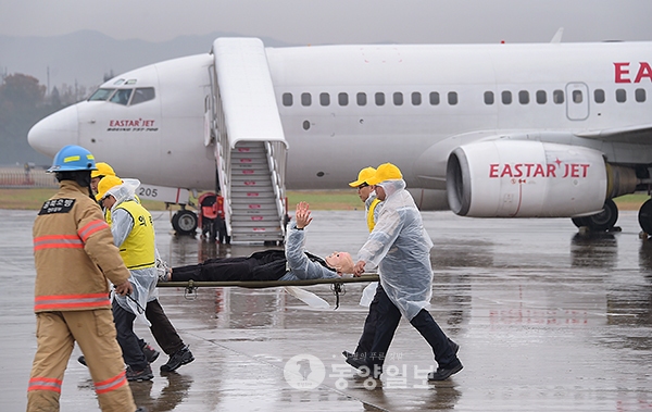 ▲ 한국공항공사 청주시사는 10일 오후 항공기 사고수습 훈련을 통해 비상상황 발생 시 인적·물적 피해 최소화와 단 시간 내 공항기능을 복구하기 위한 민·관·군 합동 종합훈련을 하고 있다. 이날 다수 사상자 발생에 따른 인명구조 훈련을 하고 있다. <사진·최지현>