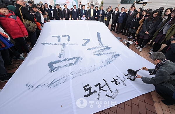 충북도교육청이 10일 오전 충북학생교육문화에서 ‘꿈길, 꿈을 찾는 길, 꿈으로 향하는 길’이라는 주제로 2016 지역맞춤형 방송문화예술 진로체험 페스티벌을 열었다. 이날 신철우 서예가가 학생들에게 전하는 메시지를 쓰고 있다. <사진·최지현>