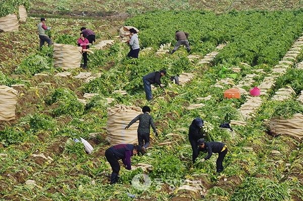 13일 청주시 청원구 오창 들녘에 농민들이 단무지용 무 수확을 하느라 바쁜 모습니다. 이날 수확한 무는 단무지용으로, 무청은 시래용으로 사용된다. <사진·최지현>