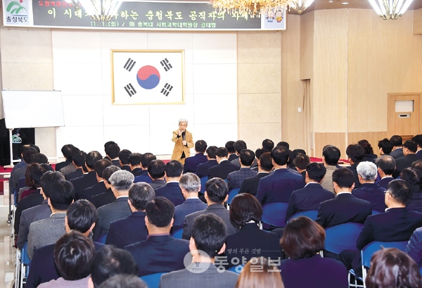 (동양일보 조아라 기자)김태창 동양포럼 주간은 지난 1일 충북도청에서 공무원들을 대상으로 ‘이 시대가 요구하는 충청북도 공직자의 자세’를 주제로 강연했다. 이날 강연에서 김 주간은 비선실세 최순실의 국정농단 논란으로 혼란스러운 상황에 직면한 현재의 대한민국에서 지방공무원들과 충북도민들이 공공성의 정립을 위해 각자의 자리에서 어떻게 행동해야 하는지 설파했다. 김태창 박사의 특강 내용을 수정, 보완해 싣는다. <편집자>