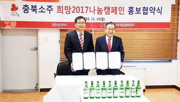 충북소주 이재혁 대표는 14일 오전 충북사회복지공동모금회를 방문해 이명식 회장과 ‘희망 2017 나눔 캠페인’ 홍보를 위한 업무협약을 체결했다.