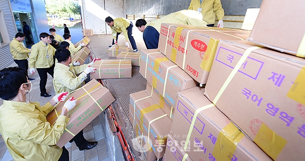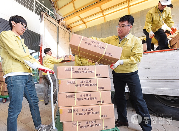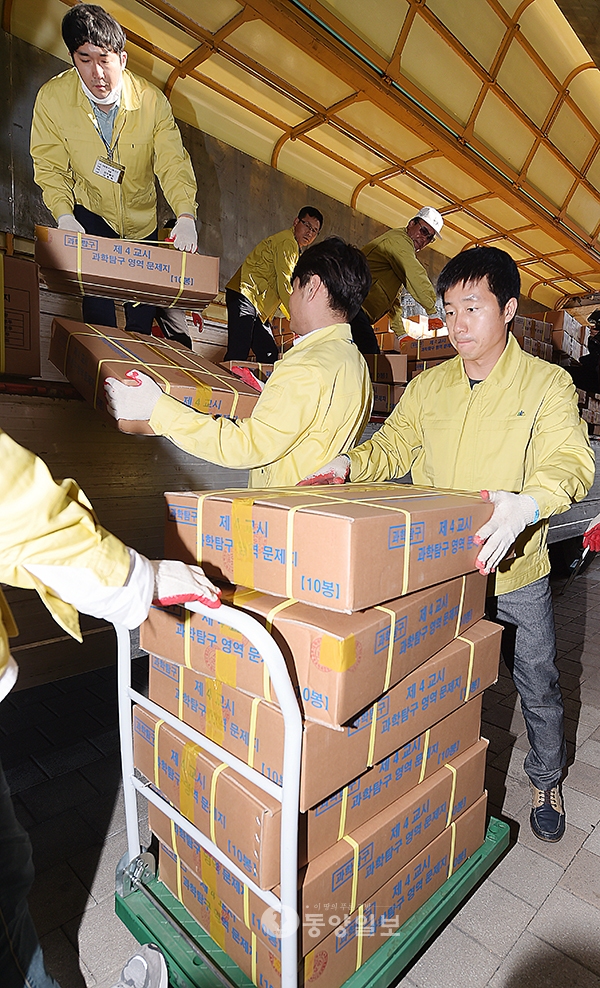 2017학년도 대학수학능력시험을 이틀 앞둔 15일 청주시 산남동 청주교육지원청에 도착한 대학수학능력시험 문답지를 교육청 관계자들이 보관장소로 옮기고 있다. <사진·최지현>