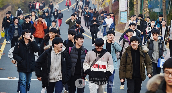 2017학년도 대학수학능력시험이 실시된 17일 청주 신흥고에서 시험을 마친 수험생들이 밝은 표정으로 시험장을 나오고 있다. <사진·최지현>