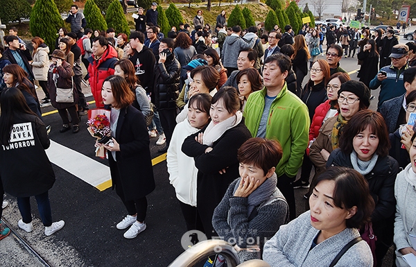 2017학년도 대학수학능력시험이 실시된 17일 청주 신흥고에서 시험을 마치고 나오는 수험생들을 많은 부모님들이 애타게 기다리고 있다. <사진·최지현>