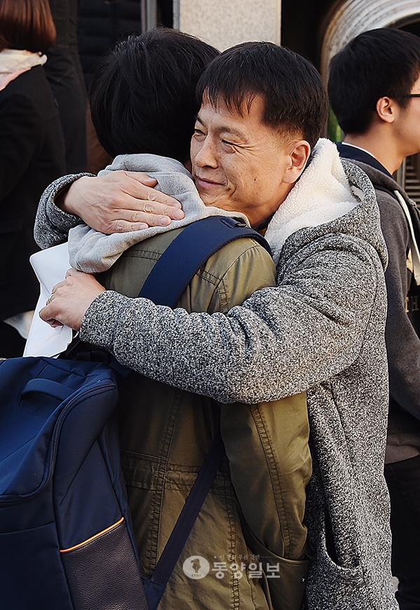 “수고했다. 아들아!”2017학년도 대학수학능력시험이 실시된 17일 청주 신흥고에서 시험을 마치고 나오는 수험생을 아버지가 따뜻하게 안아주고 있다. <사진·최지현>