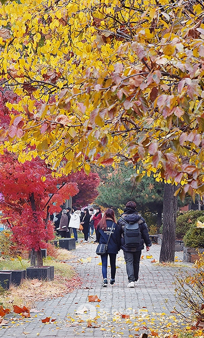 24절기 중 첫눈이 내린다는 ‘소설’(小說)을 하루 앞둔 21일 청주시 청원구 상당로에서 시민들이 단풍이 곱게 물든 거리를 지나고 있다. 기상청은 22일 낮부터 찬 공기가 남하하고 바람도 강하게 불어 체감온도가 낮아질 것으로 예상했다. 아침 최저기온 청주 4도, 충주 5도, 추풍령 5도 등 4도에서 6도. <사진·최지현>