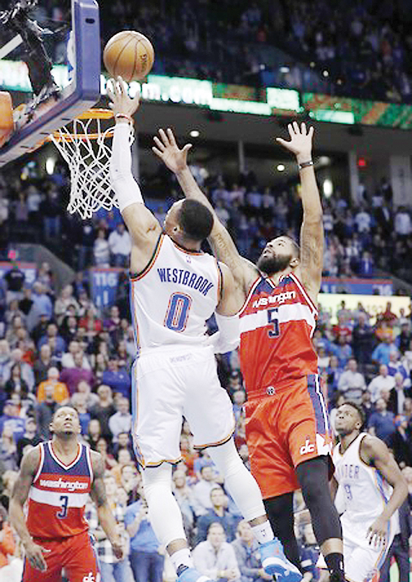 오클라호마시티는 1일(한국시간) 미국 오클라호마주 오클라호마시티의 체사픽 에너지 아레나에서 열린 2016-2017 미국프로농구(NBA) 정규리그 워싱턴 위저즈와 홈 경기에서 연장 접전 끝에 126-115로 이겼다.