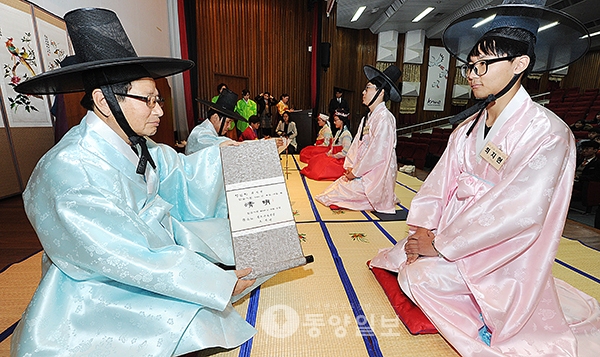 이날 큰손님들이 성년례를 마친 성년자에게 성인이 되어 이름을 함부로 하지 않고, 존중하는 의미에서 이름대신 부를 수 있는 자(字)를 내려주고 있다. <사진·최지현>