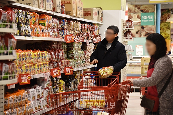 라면 가격인상을 하루 앞둔 19일 청주시 청원구의 한 대형마트에서 고객들이 라면을 고르고 있다. 농심은 일부 라면 권장소비자가격을 평균 5.5% 인상한다고 밝혔다. <사진·최지현>