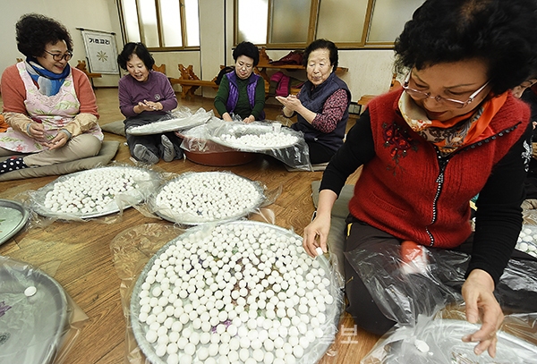 일년 중 밤이 가장 길고 낮이 가장 짧다는 절기상 동지(冬至)를 하루 앞둔 20일 청주 대한불교수도원에서 신도들이 팥죽에 넣을 새알심을 빚고 있다. 대한불교수도원은 동지인 21일 시민들에게 팥죽을 나눠 줄 계획이다. <사진·최지현>