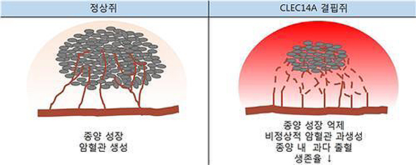 돌연변이 쥐의 암세포 주위에 형성된 혈관은 일반 암 혈관보다 더 가늘고 벽에 틈이 많은 등 구조가 불안정했다. 또 돌연변이 쥐가 암 혈관의 구조 이상으로 과다 출혈을 일으켜 죽는 경우도 많았다. CLEC14A가 있어야 암 혈관의 구조가 유지된다는 의미다.