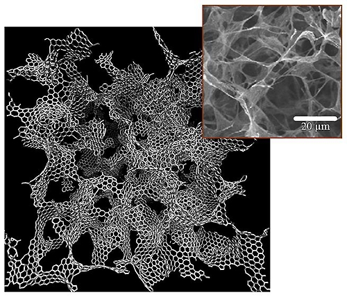 열과 압력을 가해 그래핀 조각들을 압착하는 방법으로 만드는 이 구조체는 구멍이 많아 부피에 비해 표면적이 지극히 넓은 다공성 물질로 가벼우면서도 강도는 매우 큰 것으로 나타났다.
