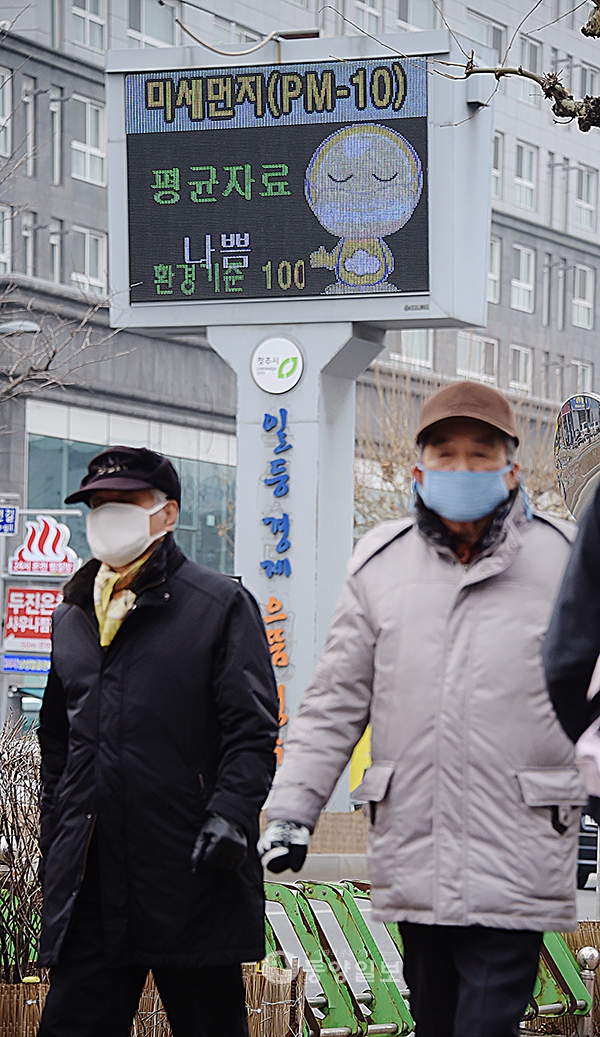 중국발 스모그 영향으로 전국적으로 초미세먼지가 기승을 부리고 있다. 18일 오후 4시 30분 충북 등 전국 대부분에 초미세먼지주의보가 발령됐다. 이날 청주시 서원구 사직동 시계탑 사거리에 설치된 대기환경정보 전광판에 미세먼지 농도가 ‘나쁨’으로 표시돼 있다. 미세먼지 농도가 '나쁨' 이상일 때에는 최대한 외출을 자제하되, 야외활동을 할 때는 황사 마스크를 반드시 착용하는 것이 바람직하다. <사진·최지현>
