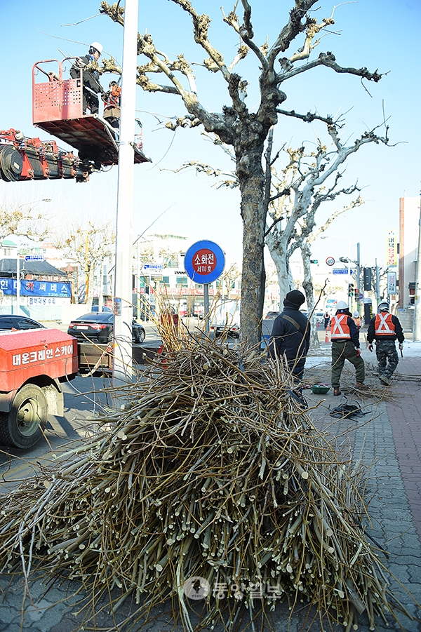 1일 오전 청주시 청원구 안덕벌로인근에서 조경 관계자가 가로수 가지치기를 하고 있다. 가지치기는 가로수가 생장을 멈춘 휴면기인 1월과 2월 사이에 실시한다. <사진·최지현>