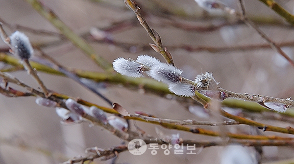 ▲ 봄의 전령사인 버들강아지가 5일 비가 오는 날씨에도 하얀 솜털을 드러내며 성큼 다가온 봄소식을 전하고 있다. <사진·최지현>