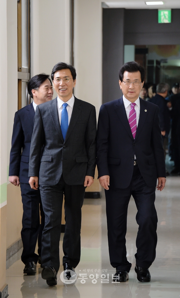 안희정 충남지사가 17일 오전 충북도청 브리핑룸 앞에서 이시종 충북지사와 악수를 나누고 있다. <사진 최지현>