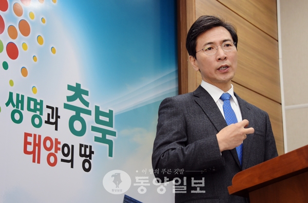 안희정 충남도지사가 17일 충북도청 브리핑룸에서 기자회견을 열고 취재진의 질문에 답변을 하고 있다. <사진 최지현>