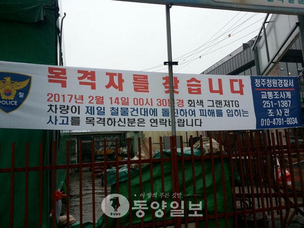 ●2017년 2월 14일 새벽 0시 30분께 청주시 청원구 율량동 그랜드호텔 앞 제일 철물건재를 돌진한 회색 그랜져 TG차량의 추돌사고 목격자를 찾습니다. 연락처=청주 청원경찰서 교통조사계(043-251-1387)