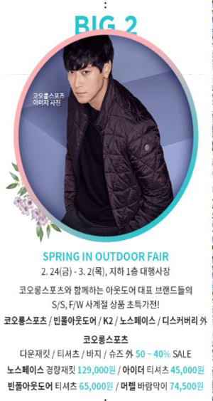 지하 1층 대행사장에선 24일부터 오는 3월 2일까지 코오롱스포츠를 포함한 아웃도어 대표 브랜들이 모여 아웃도어 봄맞이 대전이 열린다.