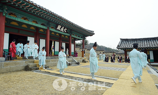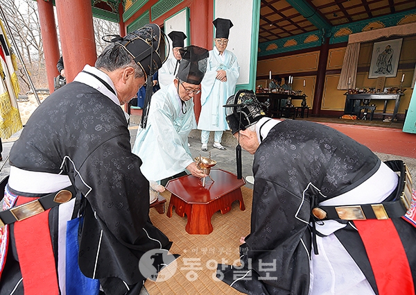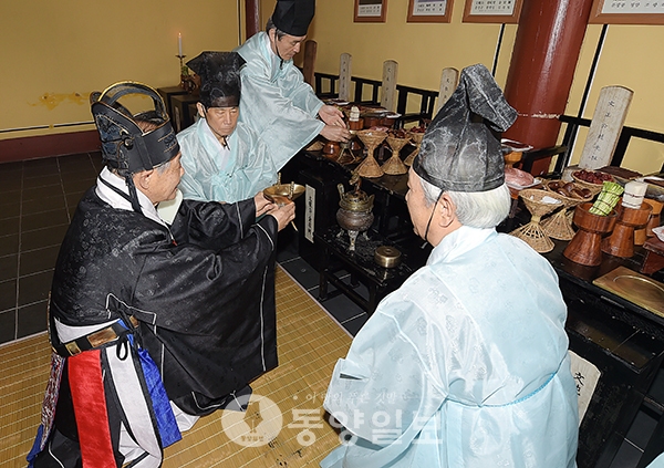 청주향교는 1일 오전 대성전에서 중요무형문화재 85호 ‘2017년 춘기석전대제’를 봉행했다. 이날 참석한 유림들이 공자를 비롯한 옛 성인들의 학덕을 추모하는 제례를 올리고 있다. <사진·최지현>