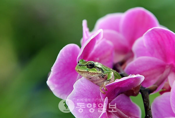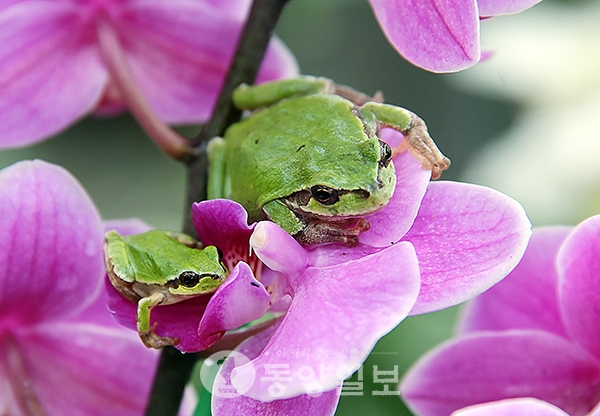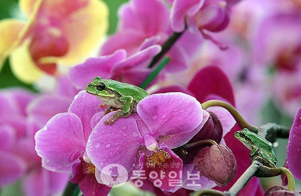동면하던 동물들이 땅속에서 깨어난다는 경칩(驚蟄)을 앞둔 2일 청주시 청원구 오창읍 충북농업기술원의 화훼 온실에서 개구리가 꽃 사이로 이동하고 있다. <사진·최지현>
