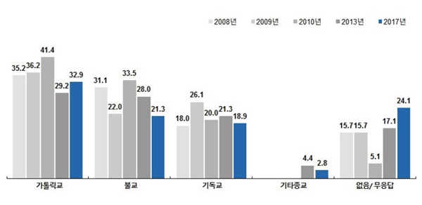 기독교윤리실천운동(이하 기윤실)이 최근 발표한 ‘2017년 한국교회의 사회적 신뢰도 여론조사’에 따르면 가톨릭교의 상대적 신뢰 비율은 2013년에 비해 3.7% 증가했으나 불교는 6.7%, 개신교는 2.4% 감소한 것으로 나타났다.