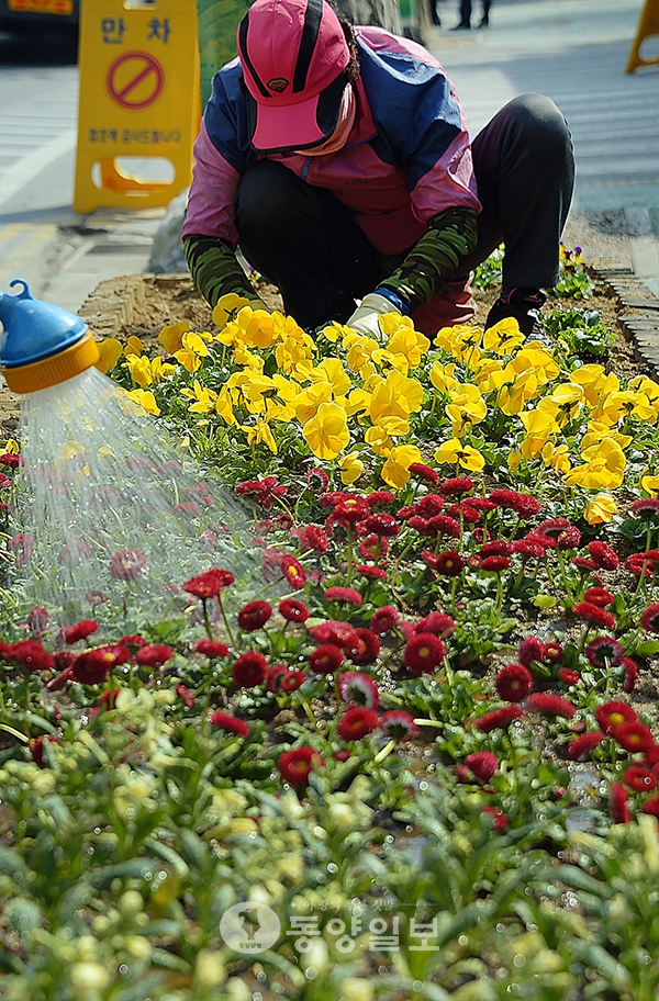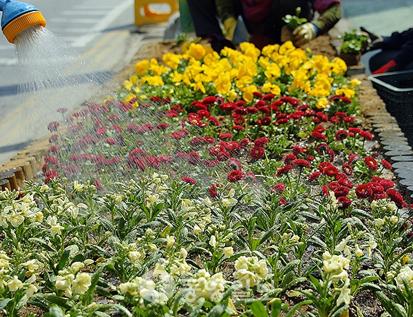 청주시는 22일 청주시청 앞 화단에 겨우내 꽃묘장에서 가꾼 팬지 등 다양한 봄꽃들을 심고 있다. <사진·최지현>