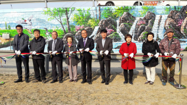 음성 금왕읍 소재 금왕대교 응천 130m 옹벽에 어릴 적 시골 추억이 가득한 벽화가 조성돼 이 곳을 지나가는 주민들의 눈길을 사로잡고 있다.
