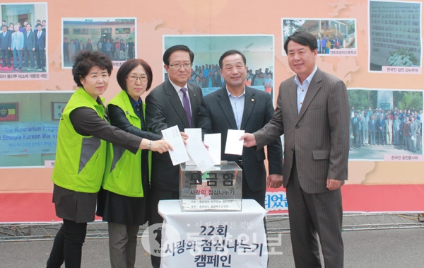 (옥천=동양일보 임재업 기자)결식아동과 불우이웃을 돕기 위한 22회 ‘사랑의 점심나누기’ 모금행사가 4일 농협중앙회 옥천군지부 앞 광장에서 열렸다. 이날 행사에는 김영만 옥천군수, 유재목 군의회의장, 임만재 부의장, 유재숙 군의원, 박수화 옥천자원봉사센터장, 정병덕 농협 옥천군지부장, 이평수 연합철강 전무이사, 강호삼 옥천경찰서 경무과장, 곽균상 민주평통옥천군지회장, 이규완 국제프라스틱 대표를 비롯한 기관 단체장, 기업인 등이 참석했다.