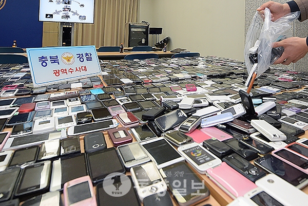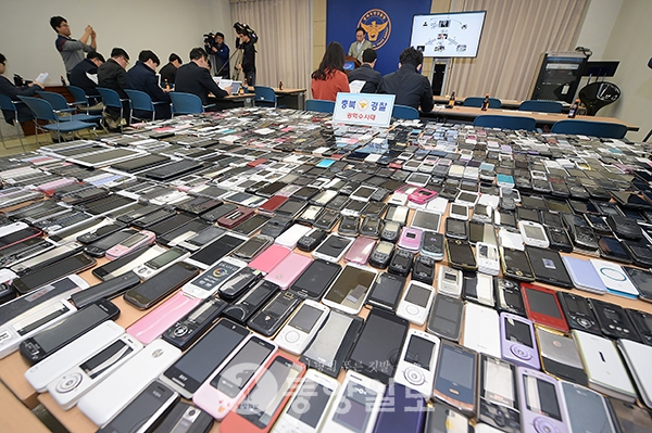 충북지방경찰청 광역수사대가 6일 오전 브리핑룸에서 대포폰 유통 일당 검거 기자회견을 하고 있다. 이날 압수한 대포폰이 진열돼 있다. <사진·최지현> 충북지방경찰청 광역수사대 관계자가 압수한 대포폰을 진열하고 있다. <사진·최지현>