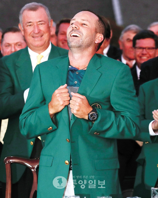 (동양일보)9일(현지시간) 미국 조지아주 오거스타의 오거스타 내셔널 골프 클럽에서 열린 81회 마스터스 토너먼트 최종일 4라운드에서 연장 승부 끝에 저스틴 로즈(잉글랜드)를 제치고 우승한 세르히오 가르시아(스페인)가 승리의 그린재킷을 입고 있다.