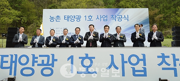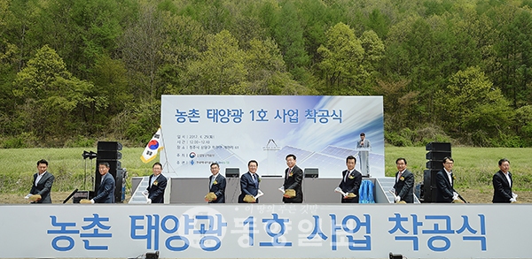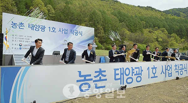 농촌 태양광1호 사업 착공식이 25일 청주시 미원면에서 열렸다. 이날 참석한 주형환(오른쪽 다섯 번째) 산업통상자원부 장관과 이시종(오른쪽 네 번째) 충북지사, 이승훈(오른쪽 세 번째) 청주시장 등 참석자들이 시삽을 하고 있다. <사진·최지현>