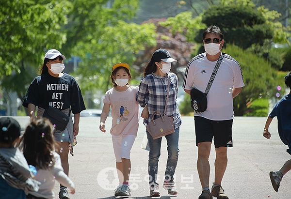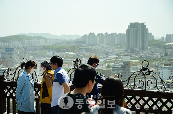 중국발 황사로 인한 미세먼지가 전국을 뒤덮은 황금연휴 마지막 날인 7일 오후 청주시 수암골 전망대에 마스크를 쓴 시민들이 청주 시내를 바라보고 있다. <사진·최지현> 7일 오후 청주랜드 우암어린이회관을 찾은 한 가족이 마스크를 쓰고 나들이 하고 있다. <사진·최지현>