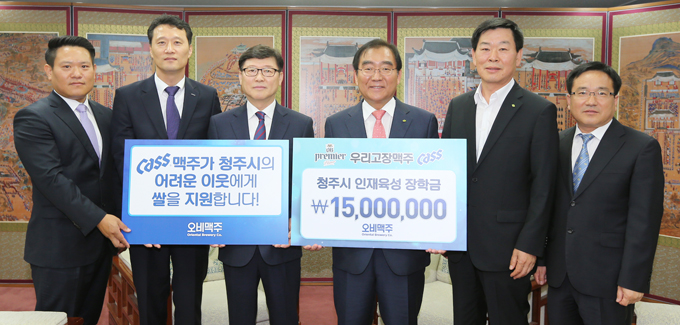 OB맥주 청주지점은 2015년부터 매년 인재양성 장학금 3000만원과 2000만원 상당의 백미를 저소득 가정에 지원해 오고 있다.