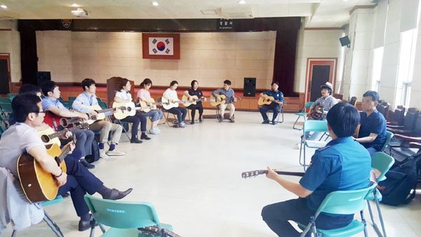이 ‘향수의 바람’은 경찰서에도 불었다. 매주 수·금요일 점심시간만 되면 고운 기타 선율이 청주흥덕경찰서 소회의실을 메운다. 바로 흥덕경찰서 기타동호회 회원들의 열띤 연습을 하는 소리다. 기타동호회에 가입된 회원들은 모두 30명. 경무계부터 각 지역 지구대까지 소속도 다양하다.