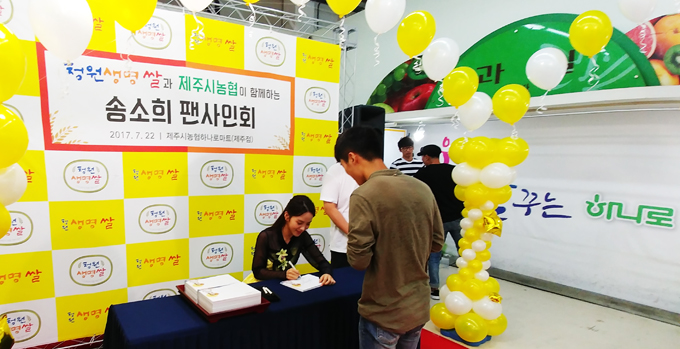 이번 팬 사인회 및 판촉행사는 청원생명쌀이 제주도에서 매월 1억원 이상의 매출신장을 기록한 것을 기념해 열렸다.